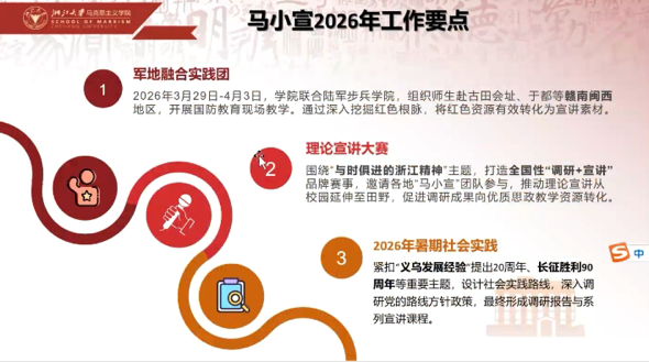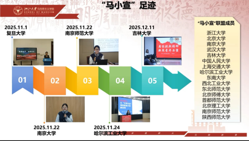 本次备课会是2026年度第二次线上集体备课会。会上明确,马小宣前身为学生讲师团,依托国家革命文物协同研究中心建设,核心定位是打造“红船边的“大思政课”浙大品牌,现已构建起“行走的“大思政课”实践与宣讲体系,体系涵盖教师理论宣讲团与学生宣讲联盟两大部分。由浙大马院主要发起、联合15家重点马院组建的全国性宣讲联盟,马小宣始终以推动“大思政课”建设、传播马克思主义理论为核心目标,吉大马院作为联盟联合单位,积极参与联盟各项建设与实践活动,与各校同行携手共进