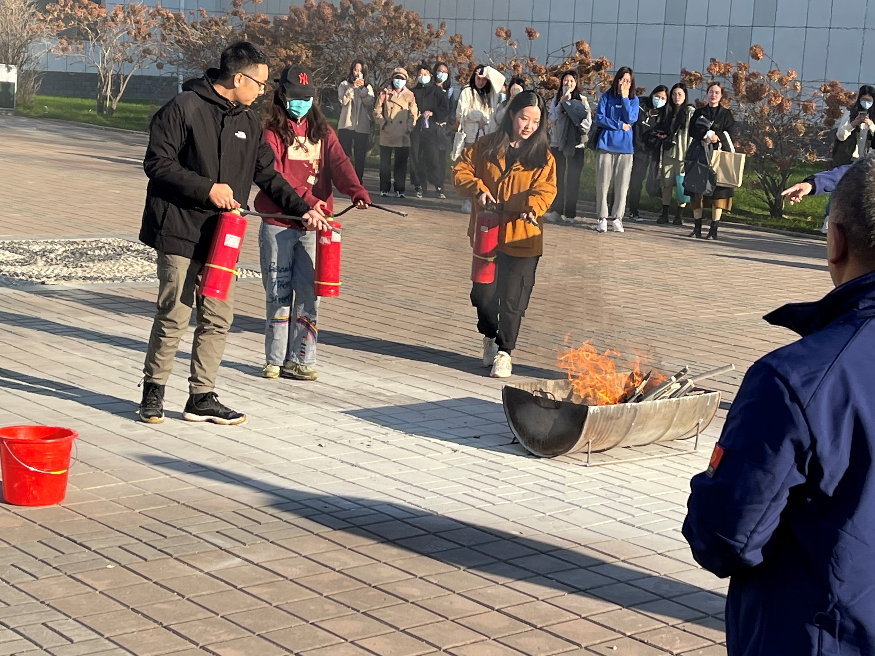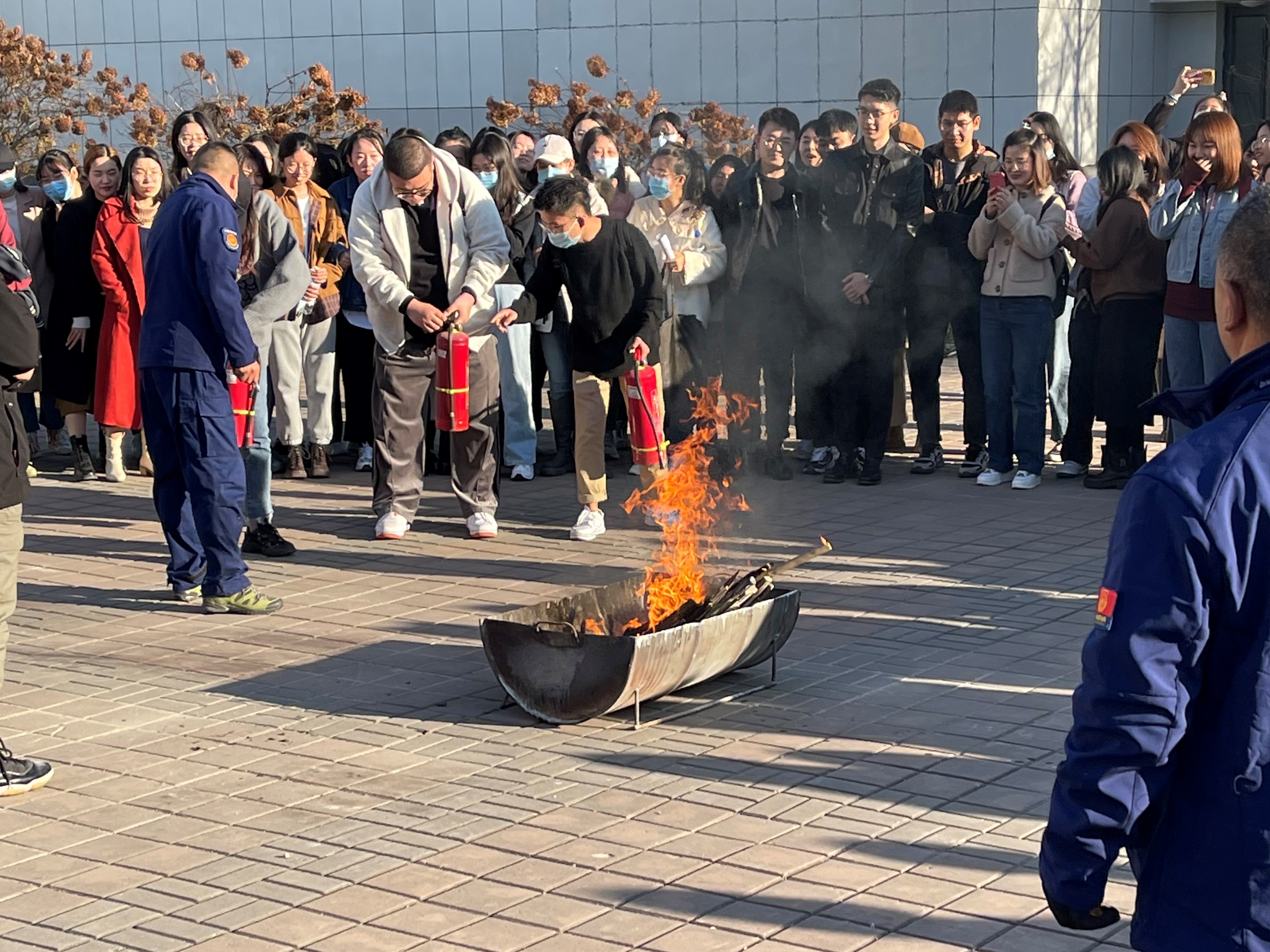 最后,刘明老师根据讲座中教授给同学们的干粉灭火器的正确使用方法做了细致的讲解和演示,为同学们在室外安排了灭火实操训练。同学们积极参与其中,在实践中进一步加深了灭火器使用步骤的深刻印象。