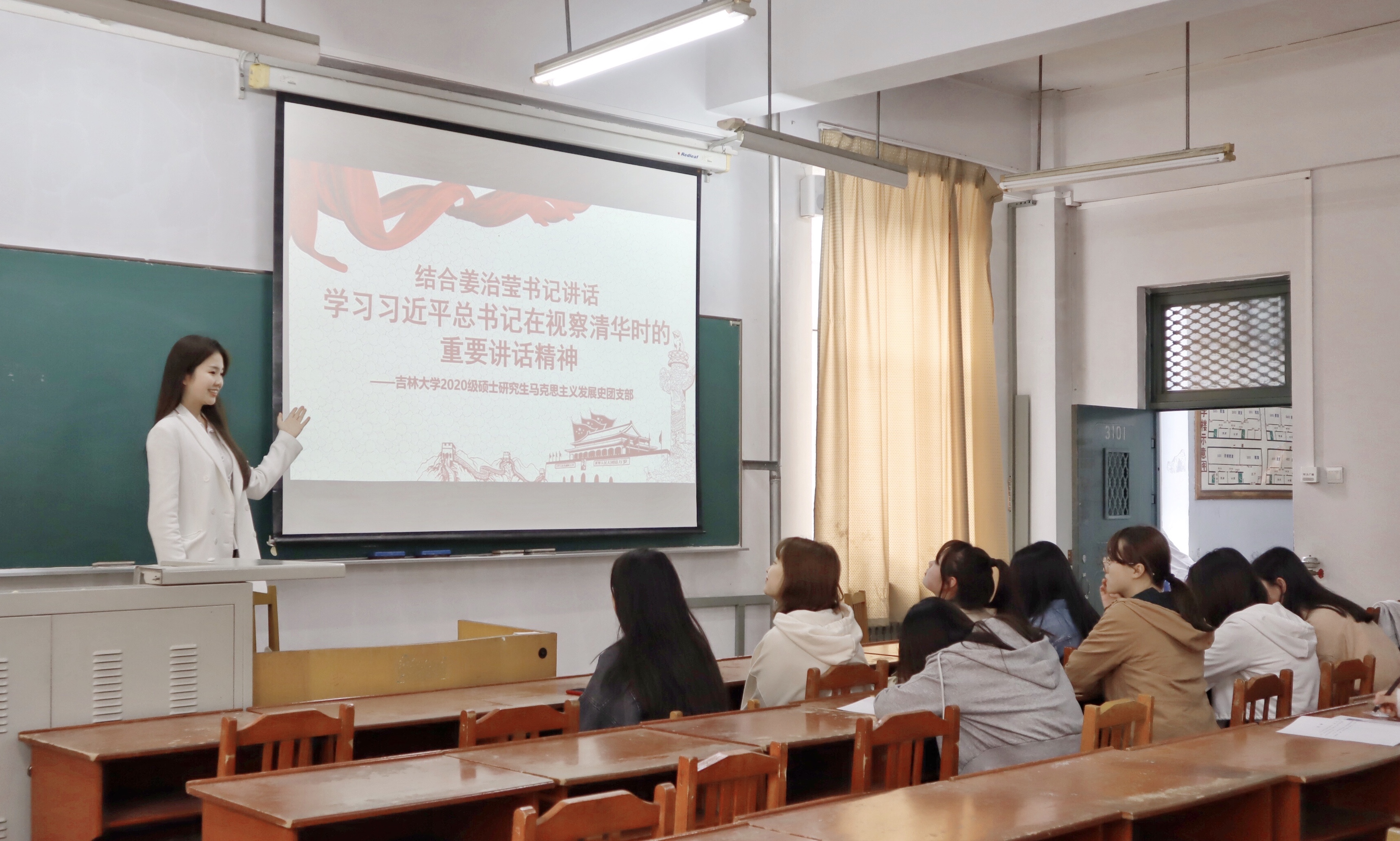 2020级硕士马克思主义发展史团支部在南湖校区第三教学楼101教室召开“结合姜治莹书记5月26日讲话,学习习近平总书记在视察清华大学时的重要讲话精神”交流会。本次会议由团支书时晓萌主持,共8名共青团员参加会议。
