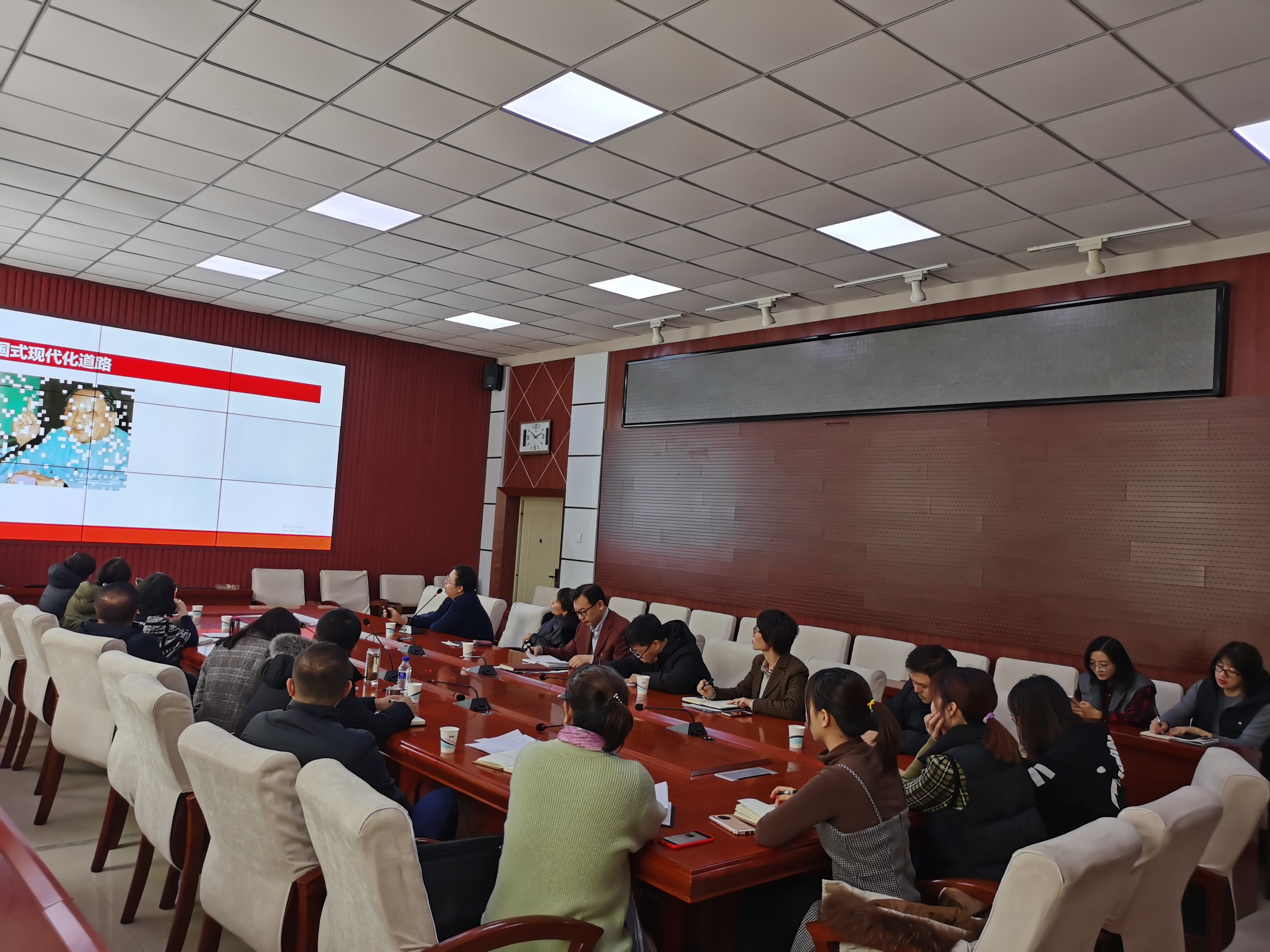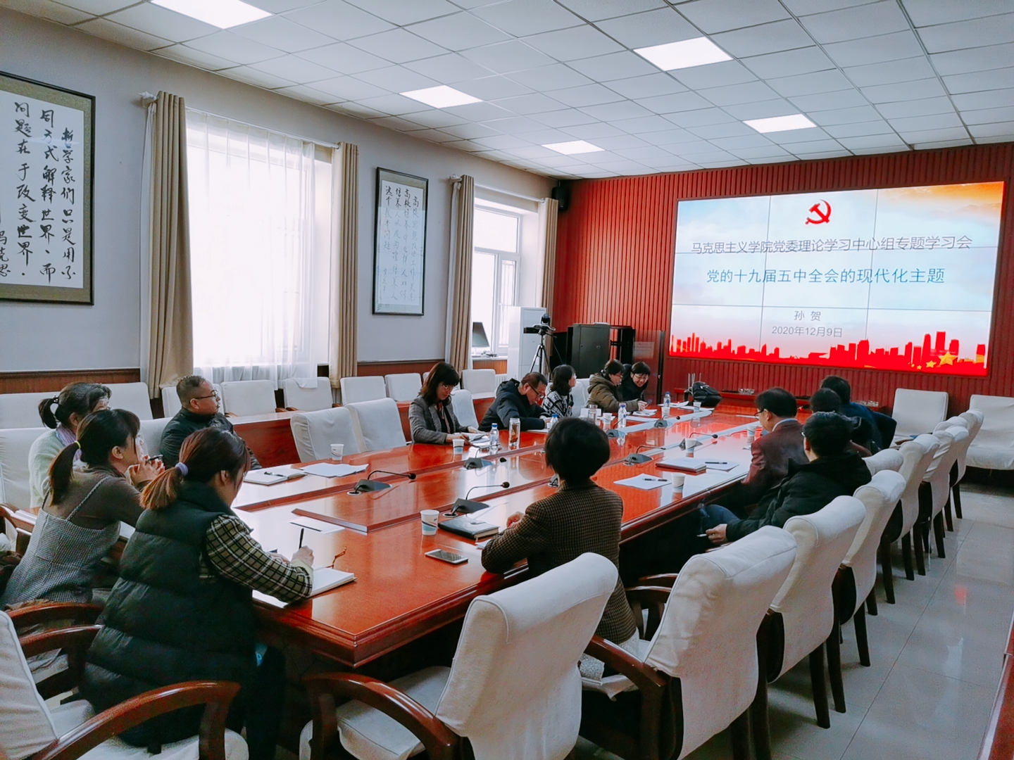 党委理论学习中心组在多媒体会议室召开十九届五中全会精神专题学习会。学院党委理论学习中心组全体成员和全体行政人员参加了学习研讨,专题学习会由中国特色社会主义理论体系研究中心副主任孙贺主讲,报告题目:党的十九届五中全会的现代化主题。党委书记霍志刚主持,院长吴宏政做总结。
