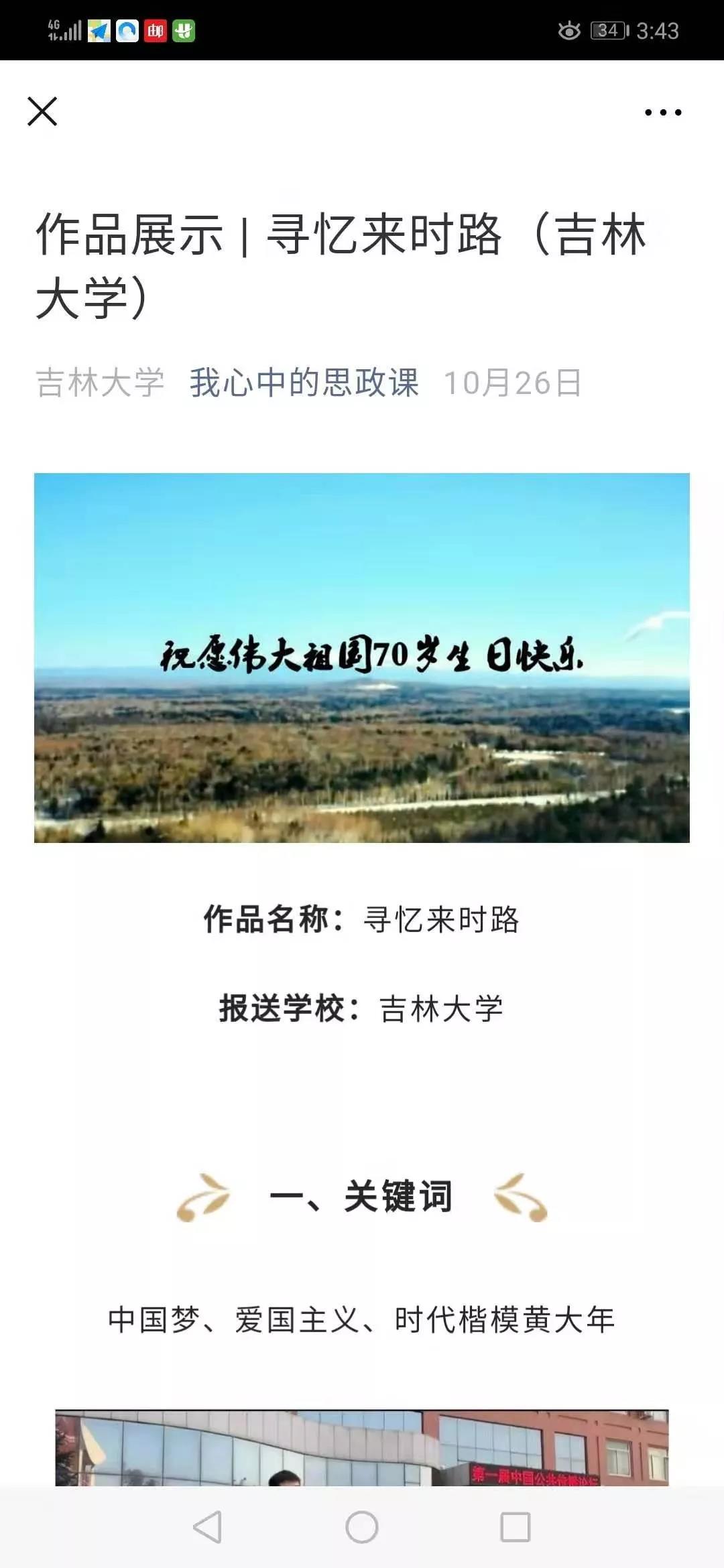和文学院的石瑛、刘卓、严俊、杨一博担任指导教师。影片以中国梦和爱国主义精神为主题,讲述了一名大学生在思政课上观看了时代楷模黄大年的相关影像资料后,产生了对“爱国主义精神究竟是一种什么样的力量”的疑惑。带着这个疑惑,她走入校史馆探查历史的脉络,感受蕴含于祖国七十年发展中的中国梦内涵,表达了当代青年大学生强烈的爱国主义精神、对祖国最诚挚的爱意和实现中华民族伟大复兴中国梦的坚定信心。