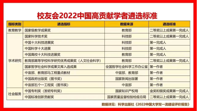 为坚决贯彻落实国家《深化新时代教育评价改革总体方案》、教育部关于清理“五唯”等文件政策要求,2022年1月,艾瑞深研究院双一流建设评价课题组在多年开展“中国杰出人文社会科学家”遴选基础上,在国内首次提出“中国高贡献学者”指标,引入校友会2022中国大学排名评价体系,坚决破除中国大学排名中唯论文、重理轻文等不良价值导向。“中国高贡献学者”遴选突出评价学者的教育教学水平、学术研究水平、创新质量和实际社会贡献,为科学客观系统评价研究分析中国高校学者的表现提供依据。