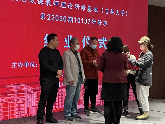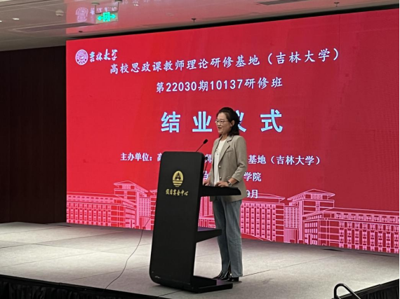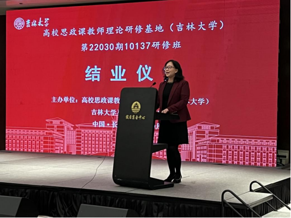 的一员,希望参训的思政课教师同仁们要牢记思政课教师身份和使命,在回到各自工作岗位后,为思想政治理论课教学注入新的活力,为各兄弟高校思想政治理论课的教育教学做出新的贡献。来自长春汽车工业高等专科学校的王静老师作为学员代表发言,她表示三天的研修学习,干货满满,收获满满,各位学员同仁会以本次培训内容为新的起点,以所学理论反哺课堂教学,努力实现培训理论向教学实践的转化,真正令学生做到内化于心、外化于行,着力实现思政课立德树人、培根铸魂的育人目标。